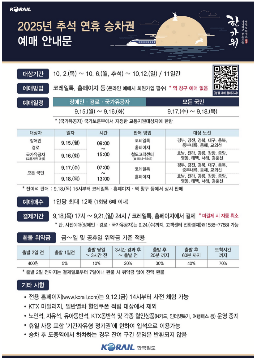 | 교통약자 우선 예매 | 65세 이상, 장애인, 국가유공자 등 | 9월 15일(월), 9월 16일(화) 09:00~15:00 | 코레일톡, 코레일 홈페이지, 전화(1544-8545) |